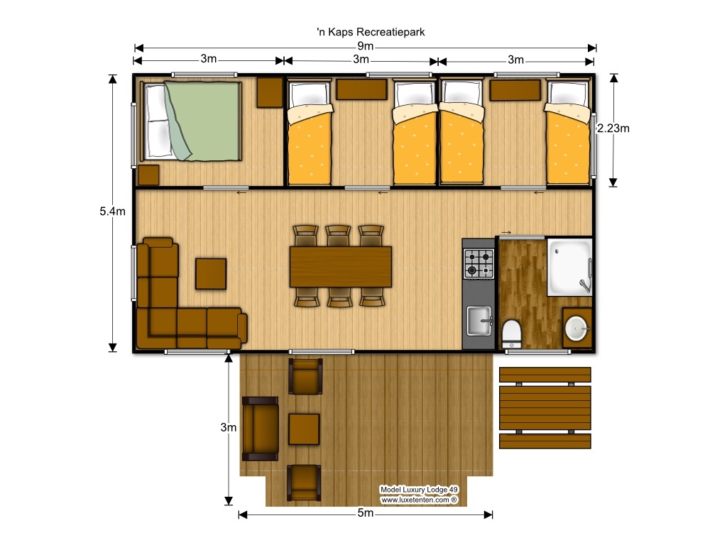 Beleef de ultieme glamping ervaring in een sfeervol ingerichte safaritent. Bij aankomst hoef je alleen maar je koffers uit te pakken en de vakantie kan beginnen. Geen gesleep met borden en bestek of tuinmeubels, want dat is aanwezig. De 6 persoons safaritent heeft een knusse zithoek, complete keuken, badkamer met douche en toilet en drie slaapkamers elk met 2 bedden. Op de 15m2 houten veranda voor de tent staat steigerhouten tuinmeubilair. Aanvullend beschik je ook over een eigen picknicktafel.